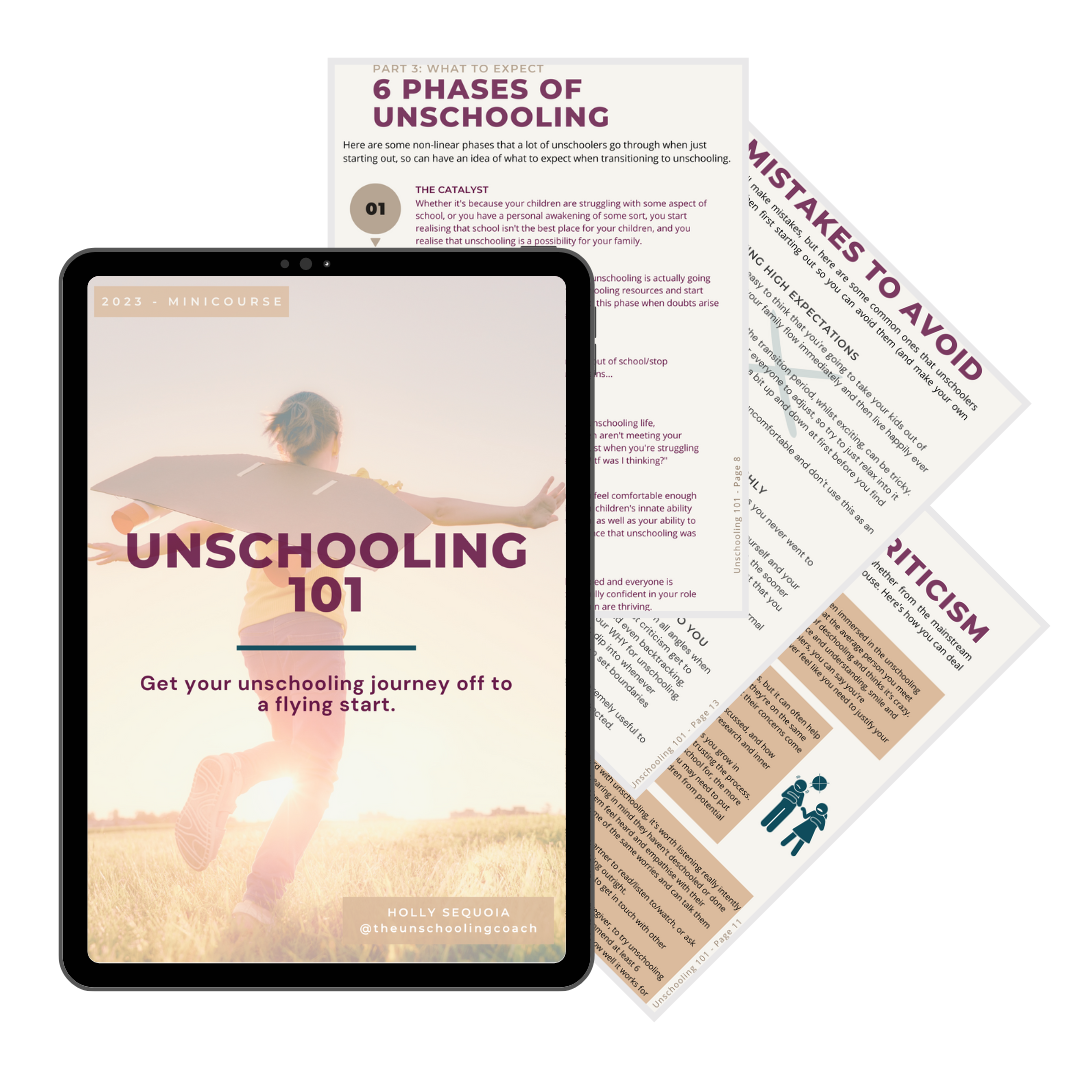 I offer a bunch of freebies as well as a 90-day group program for new unschoolers. I also have a 121 coaching package on an application basis, for those who are really committed and want to dive deeper.